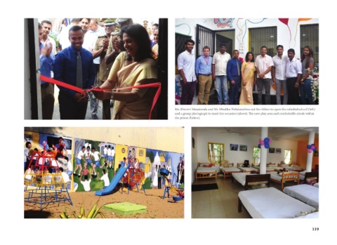 Ms. Shiromi Masakorala and Mr. Mindika Thilakarathna cut the ribbon to open the refurbished cell (left) and a group photograph to mark the occasion (above). The new play area and comfortable abode within the prison (below). 119