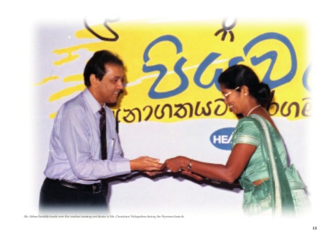 Mr. Abbas Esufally hands over the teacher training certificate to Ms. Chandrani Welagedera during the Piyawara launch. 15