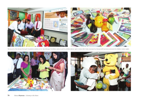 The launch of the Hemas Outreach Foundation website at the ‘Ape Sihinaya’ Exhibition (above) and the exhibits (above right & below left). Roles reversed, the Hemas staff members entertain the children (below right).